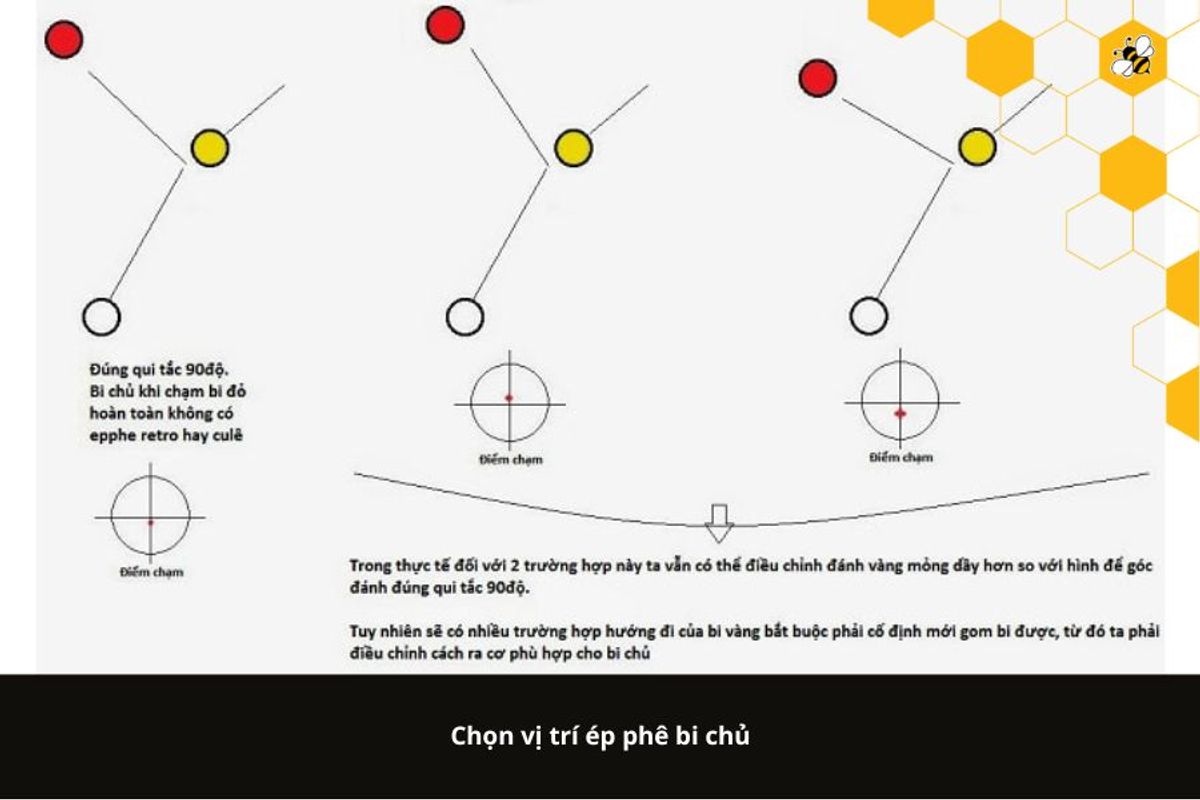 - Vị trí ép phê: Đánh bi chủ (màu trắng) ép phê thuận đầu cơ hơi chếch xuống dưới nhẹ.