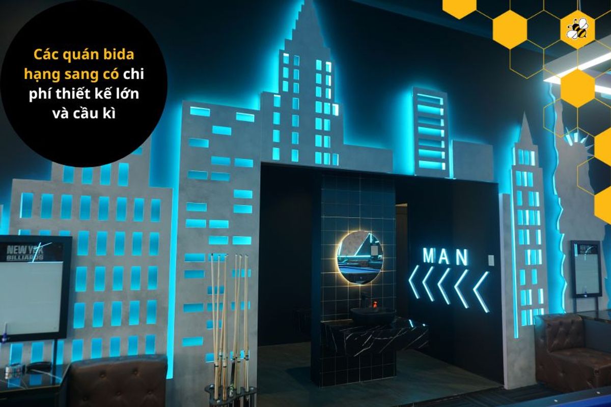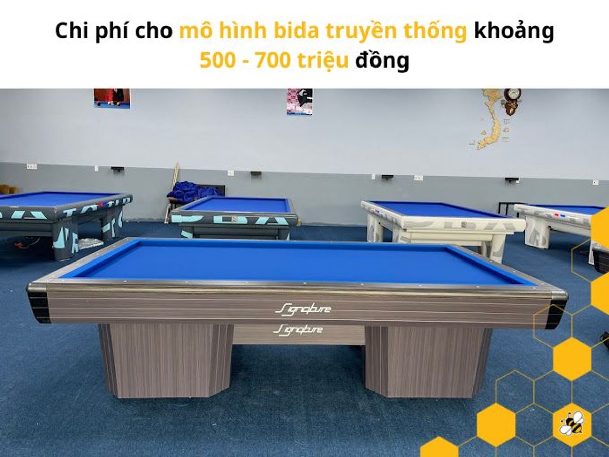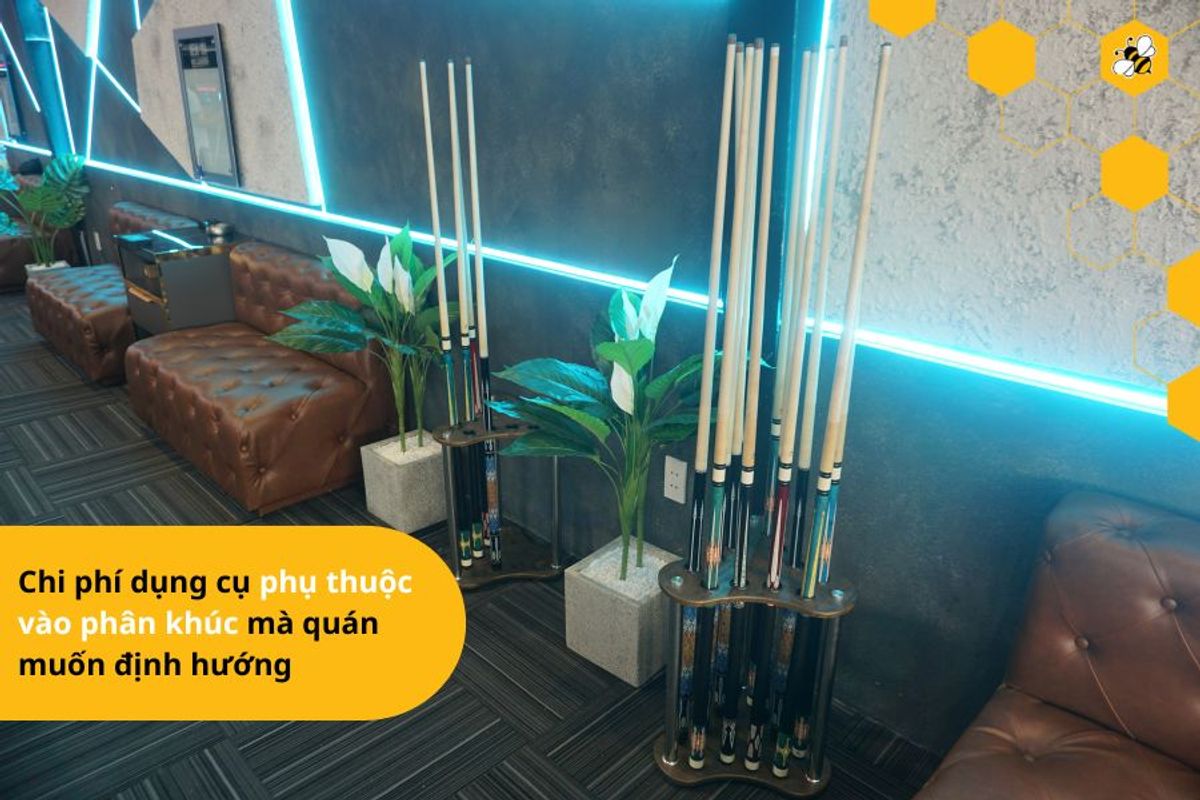 - Chi phí mua sắm công cụ dụng cụ, trang trí nội thất: khoảng 400-800 triệu đồng, tùy thuộc vào số lượng và chất lượng của bàn bida, bóng, gậy, đèn, hệ thống âm thanh, kệ tủ đựng đồ cho khách, v.v. Chi phí này phụ thuộc vào phân khúc mà quán muốn định hướng là cao cấp hay bình dân. Nếu quán cao cấp thì chắc chắn chi phí cho vật tư công cụ sẽ cao để thể hiên đẳng cấp, còn quán bình dân thì có thể sử dụng vật tư tiêu chuẩn là đảm bảo.