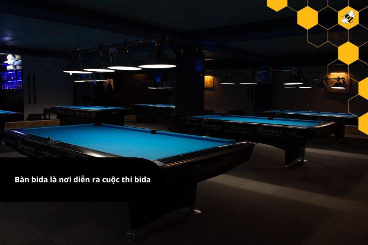 Bàn bida là nơi diễn ra cuộc thi bida. Đây là một bề mặt phẳng và trơn tru, thường được làm từ gỗ hoặc vật liệu composite chất lượng cao, được sử dụng để đặt bi và chơi trò chơi. Khi tham gia chơi thì mỗi người chơi sẽ có một bi cái có màu sắc khác nhau, hoặc đánh số để phân biệt.