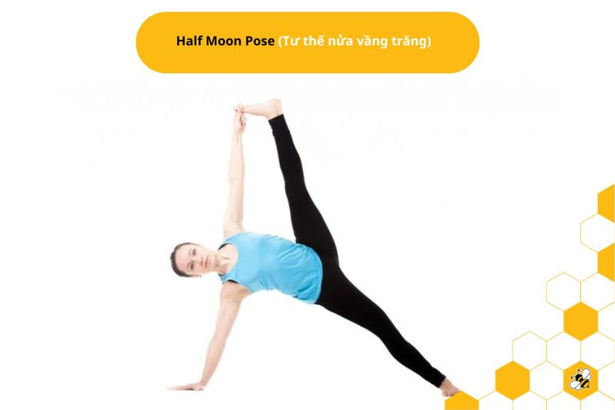 - Half Moon Pose (Tư thế nửa vầng trăng): Bắt đầu ở tư thế Tam giác hoặc Góc mở rộng, đặt một tay lên hông của chân sau và đưa tay kia về phía trước. Động tác này giúp tăng cường sự linh hoạt và cân bằng.