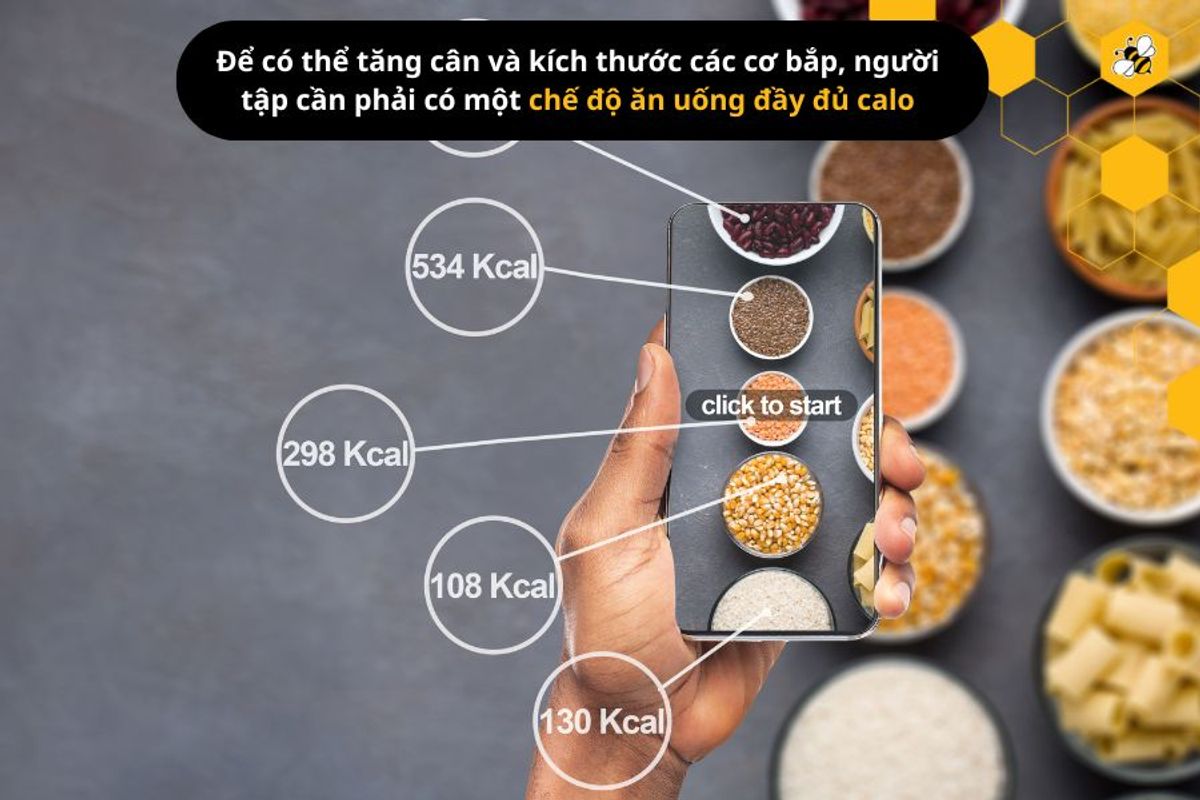 - Để có thể tăng cân và kích thước các cơ bắp, người tập cần phải có một chế độ ăn uống đầy đủ calo và thậm chí là tăng thêm calo so với mức calo vừa đủ của bản thân cần thiết.