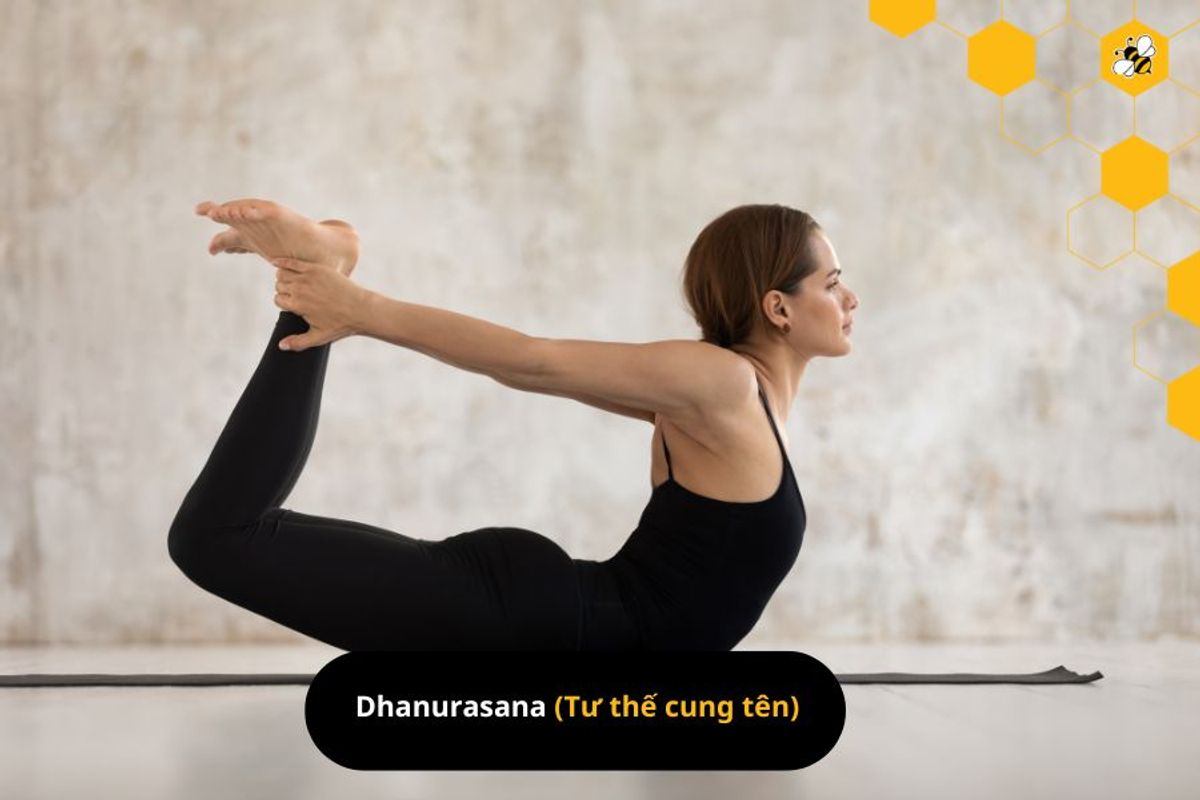 - Dhanurasana (Tư thế cung tên): Nằm sấp, bẻ đầu gối và nâng chân lên, giữ bằng tay. Tư thế này giúp tăng cường cơ bắp đùi và bắp chân.
