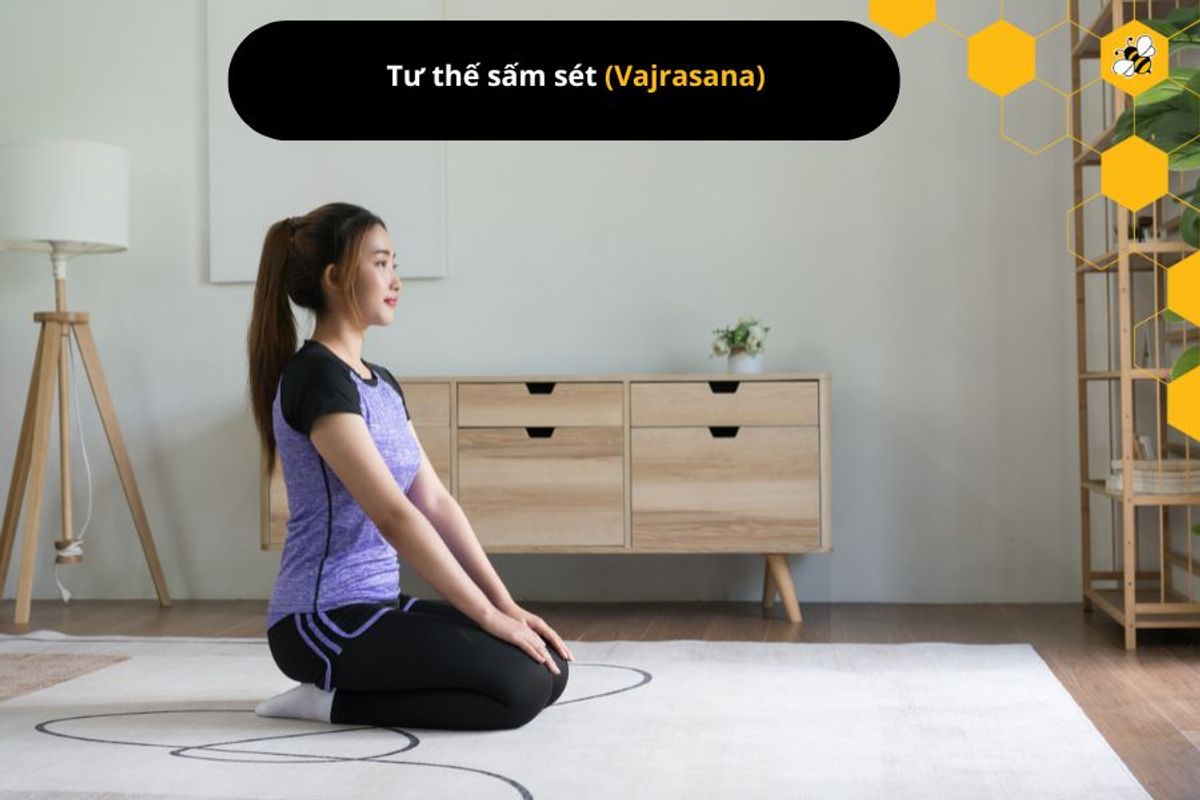 - Tư thế sấm sét (Vajrasana): Tư thế này giúp cải thiện tiêu hóa và tăng cường sự linh hoạt của cơ chân. Bạn ngồi chân gối gập lại và đặt mông lên gót chân. Tư thế này cũng giúp giảm căng thẳng và tạo sự thư giãn cho cơ thể.