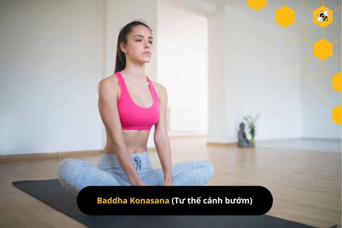 - Baddha Konasana (Tư thế cánh bướm): Ngồi thẳng, đặt chân gần mông và đặt tay lên chân. Tư thế này giúp giãn cơ và tạo sự linh hoạt cho cơ thể.