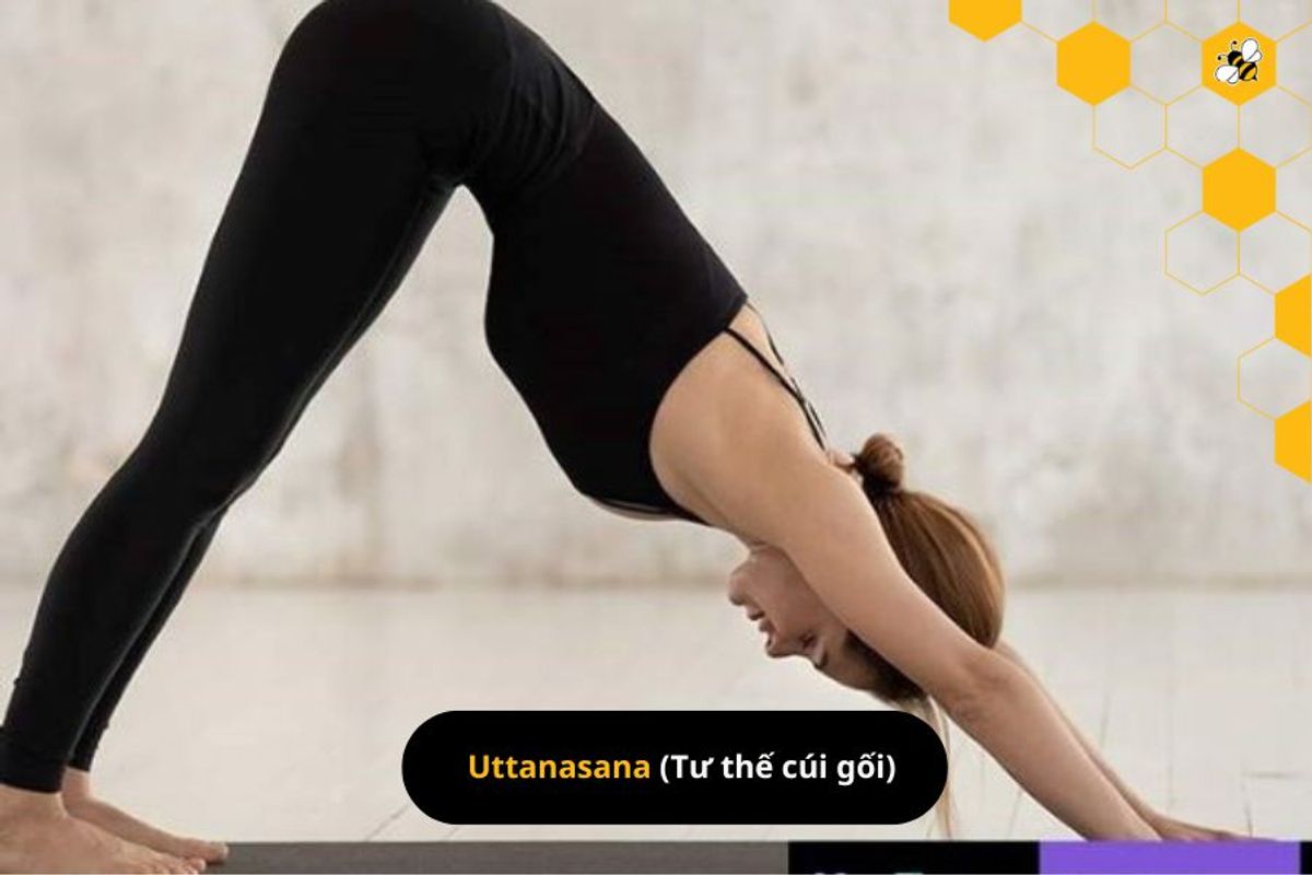 - Uttanasana (Tư thế cúi gối): Đứng thẳng, cúi xuống để tay chạm đến mặt đất hoặc chân. Tư thế này giúp giảm căng thẳng và tăng cường tuần hoàn máu.
