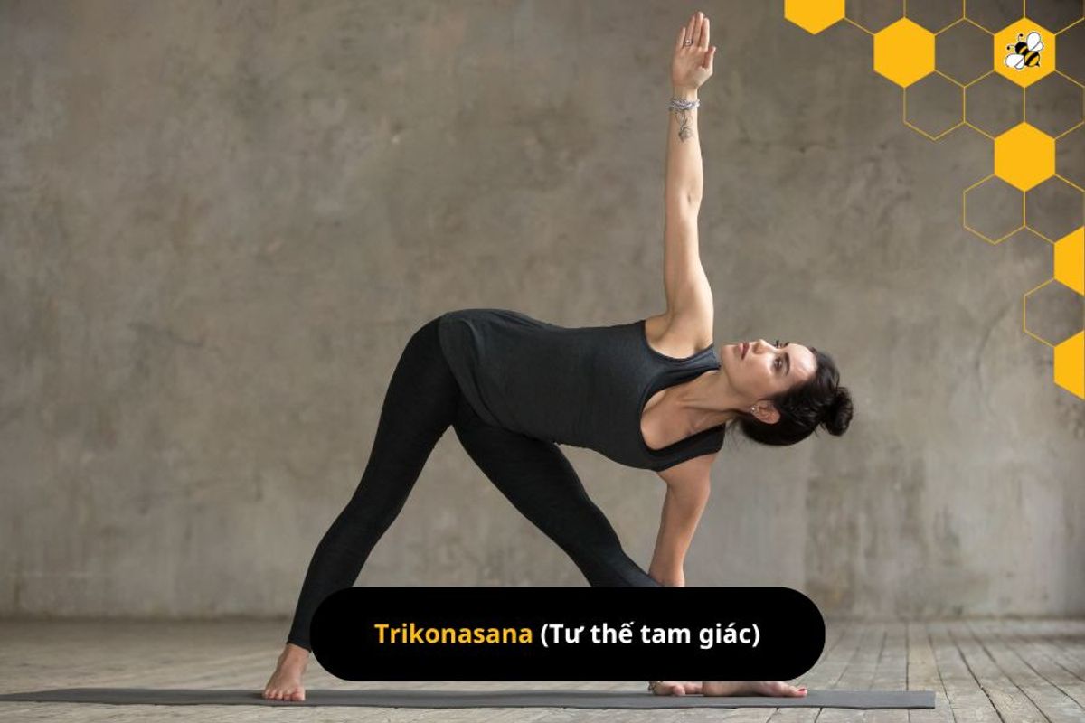 - Trikonasana (Tư thế tam giác): Đứng thẳng, bước chân ra và duỗi tay ra hai bên. Tư thế này giúp tăng cường cơ bắp và cải thiện cân bằng.