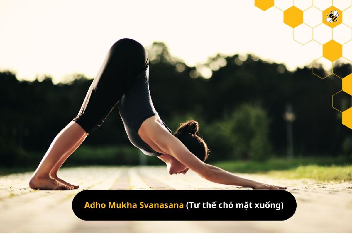 - Adho Mukha Svanasana (Tư thế chó mặt xuống): Đứng bốn chân, đẩy mông lên và đặt đầu xuống. Tư thế này giúp giãn cơ lưng và cơ vai.