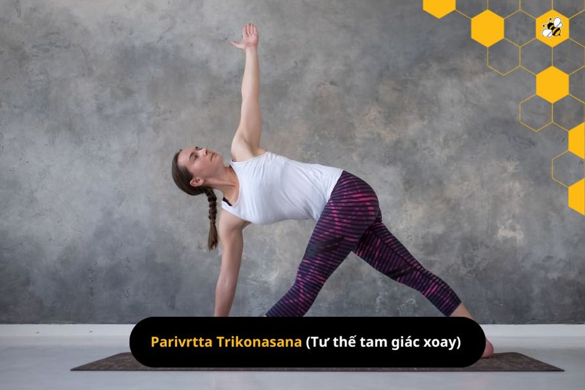 - Parivrtta Trikonasana (Tư thế tam giác xoay): Tương tự như tư thế tam giác, nhưng bạn xoay người và đặt một tay lên đất. Tư thế này giúp tăng cường cơ bắp và tạo sự linh hoạt cho cơ thể.