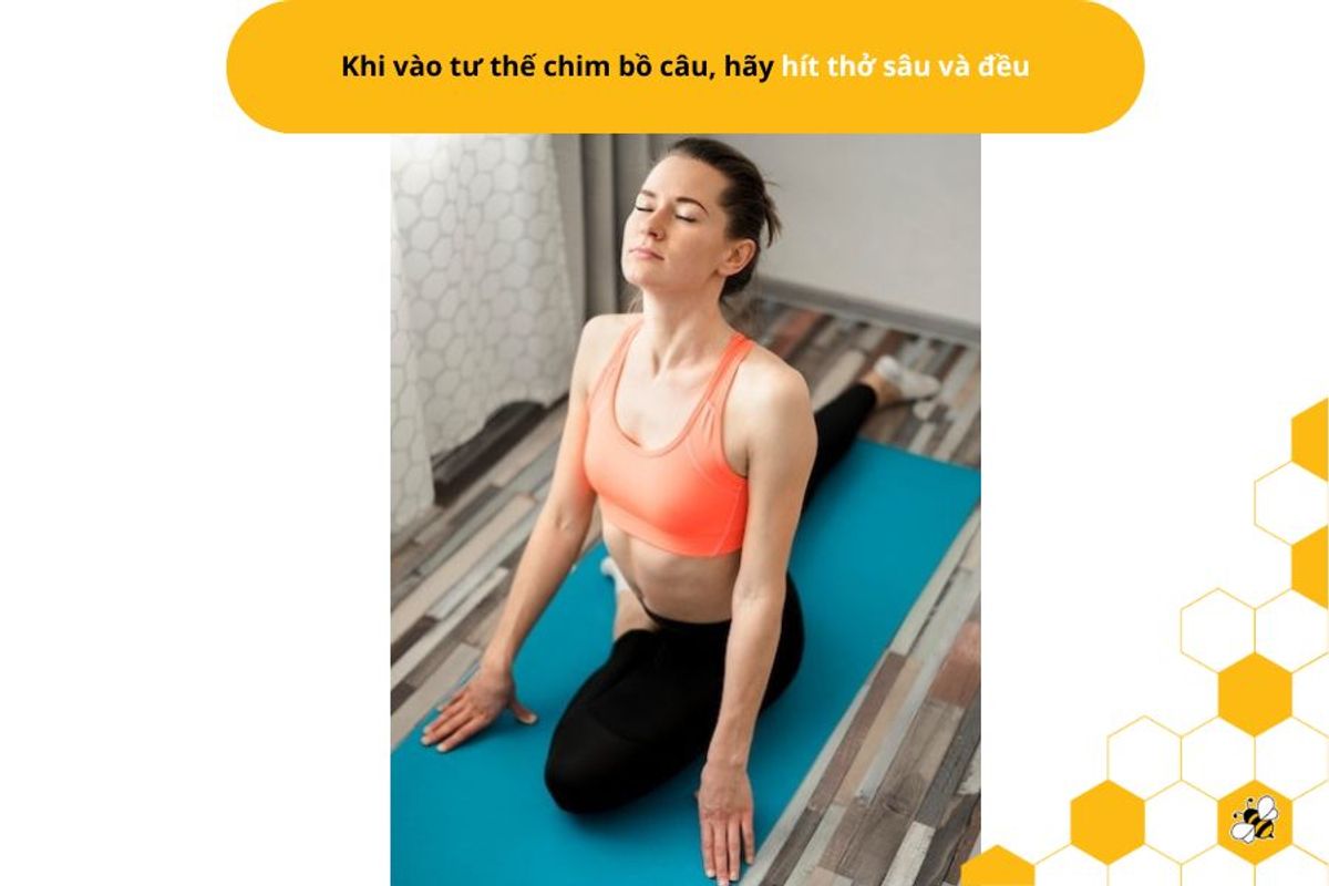 - Kỹ thuật hít thở: Khi vào tư thế chim bồ câu, hãy hít thở sâu và đều. Hít thở vào khi kéo giãn cơ và hít thở ra khi giữ tư thế. Điều này giúp cơ bạn được cung cấp đủ oxy và giảm căng thẳng.