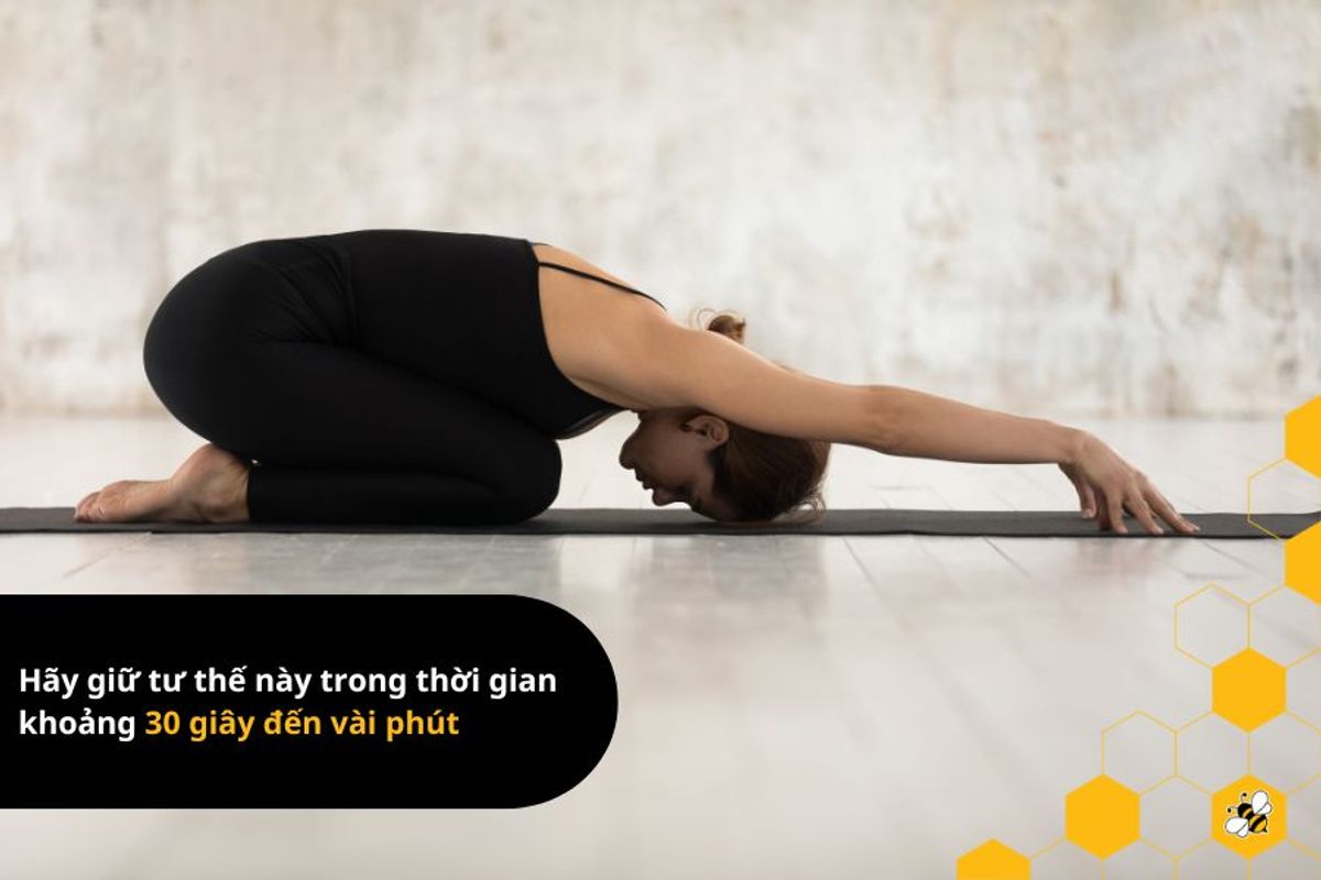 - Tư thế em bé về cơ bản là một tư thế nghỉ ngơi, vì vậy bạn hãy giữ tư thế này trong thời gian khoảng 30 giây đến vài phút. Để cơ thể có thể thoát khỏi tư thế này, bạn hãy kéo dài thân về trước và hít sâu vào, hoạt động chủ yếu bằng các cơ chính và nâng thân người của bạn lên cao.