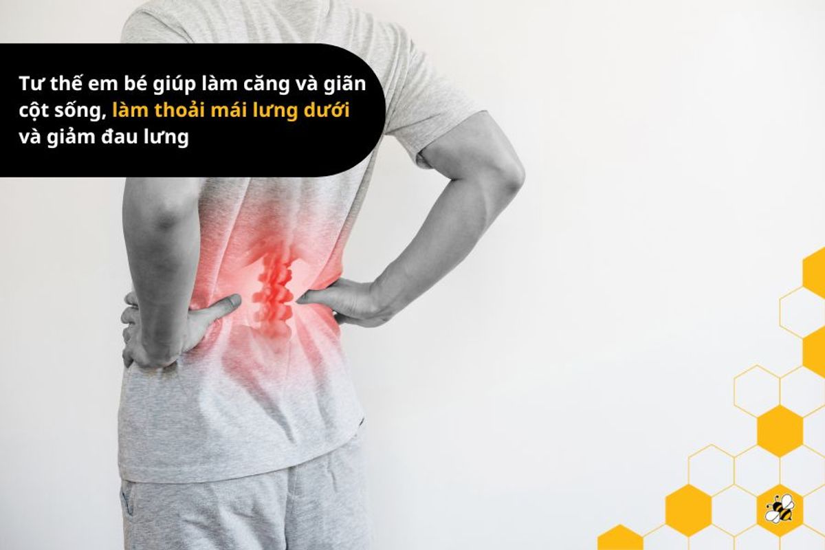 - Giảm căng thẳng ở lưng dưới: Đau lưng dưới phổ biến ở nhiều người. Tư thế em bé sẽ tác động trực tiếp và điều chỉnh vùng lưng, xương sống, tăng cường sự thư giãn và sự dẻo dai cho vùng lưng dưới. Tư thế em bé giúp làm căng và giãn cột sống, làm thoải mái lưng dưới và giảm đau lưng..