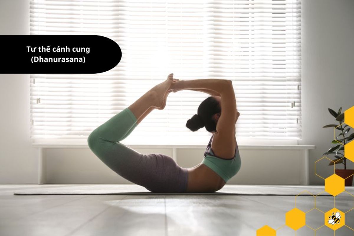 - Tư thế cánh cung (Dhanurasana): Nằm bụng, gập chân và cầm chân bằng tay. Khi thở vào, kéo căng cơ ngực và khi thở ra, thả lỏng.