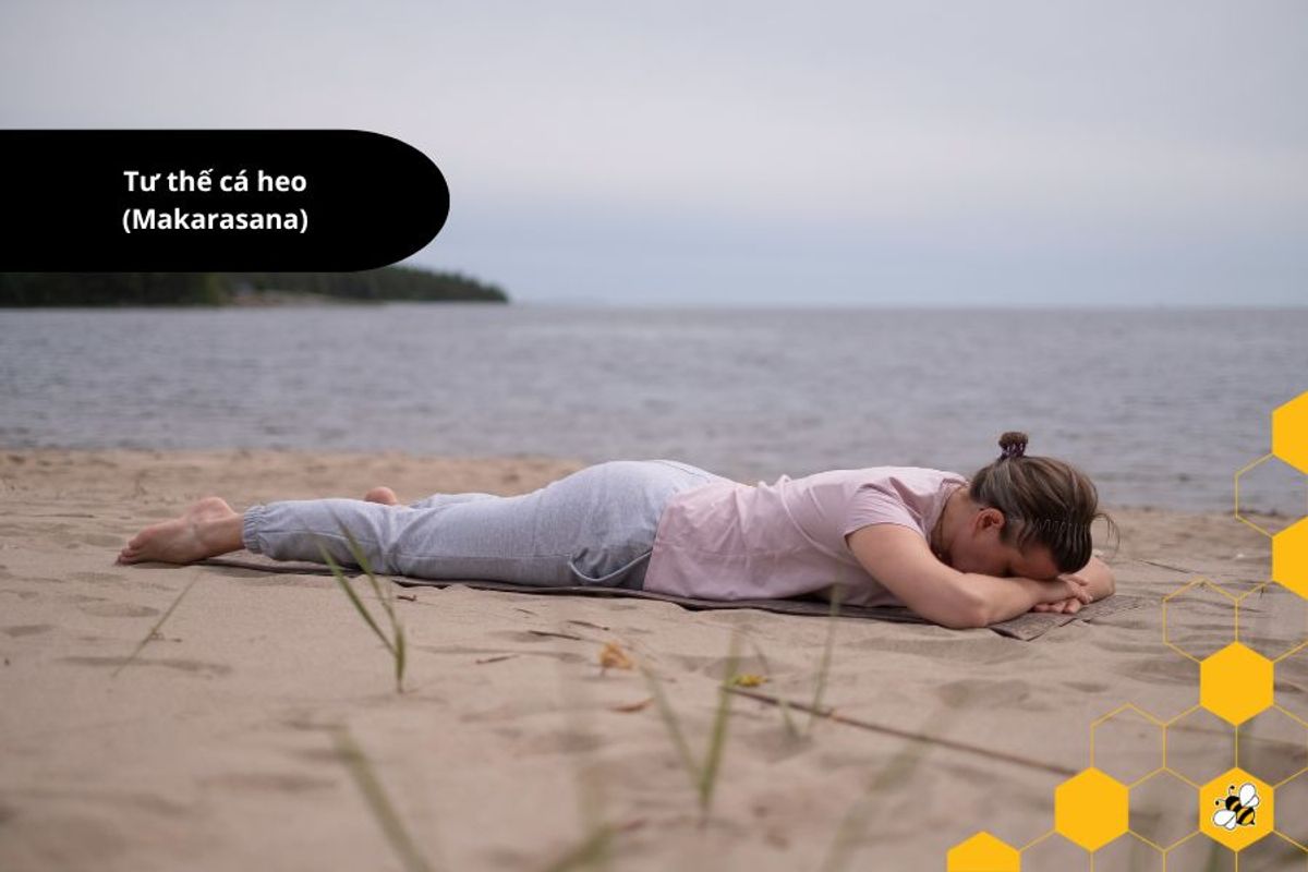 - Tư thế cá heo (Makarasana): Nằm bụng, đặt cẳng tay và cẳng chân xuống sàn. Khi thở vào, kéo căng cơ bụng và khi thở ra, thả lỏng.