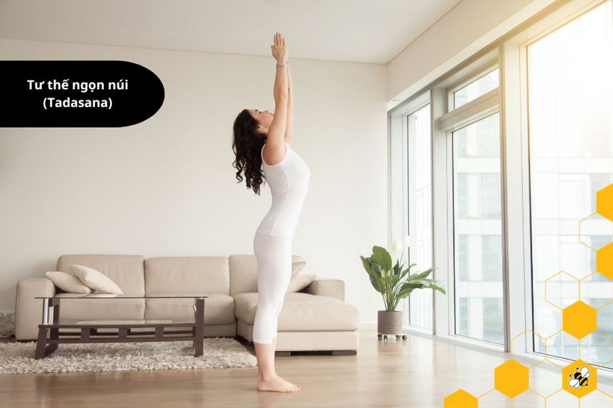 - Tư thế ngọn núi (Tadasana): Đứng thẳng, chân hơi hẹp, đặt tay dưới hông. Khi thở vào, kéo dãn cơ thể lên và khi thở ra, thả lỏng. Lặp lại và tập trung vào hơi thở.
